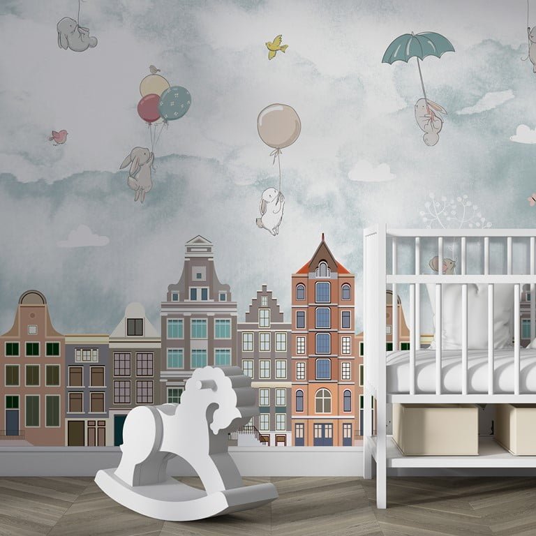 Diese bezaubernde Fototapete zeigt eine Szene mit Tieren, die über die Stadt fliegen und verleiht jedem Raum Charme und Einzigartigkeit. Es ist ideal für das Kinderzimmer, das Wohnzimmer oder das Büro und bringt eine angenehme Atmosphäre und fröhliche Akzente in die Einrichtung.
