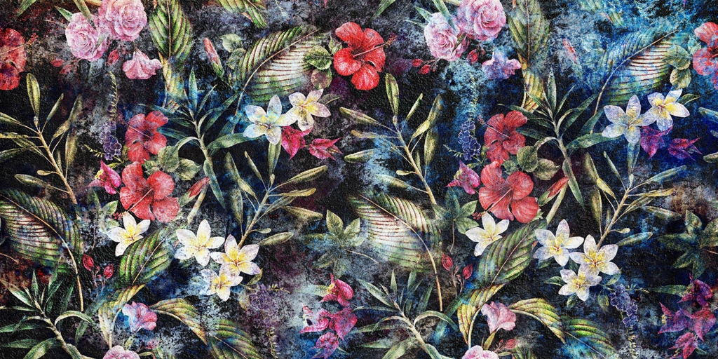 Wandmalerei aus farbigen Blumen auf dunklem Hintergrund